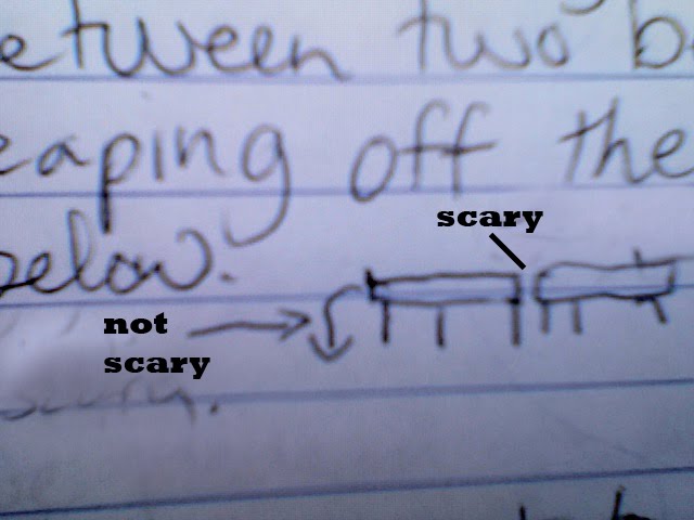 Truman spent some time ever-so-carefully crossing the 3-inch divide between two benches and then leaping off the end to land 2 ft. below. I didn't bring my camera out at the time, so later I channeled Demetri Martin and drew a diagram: